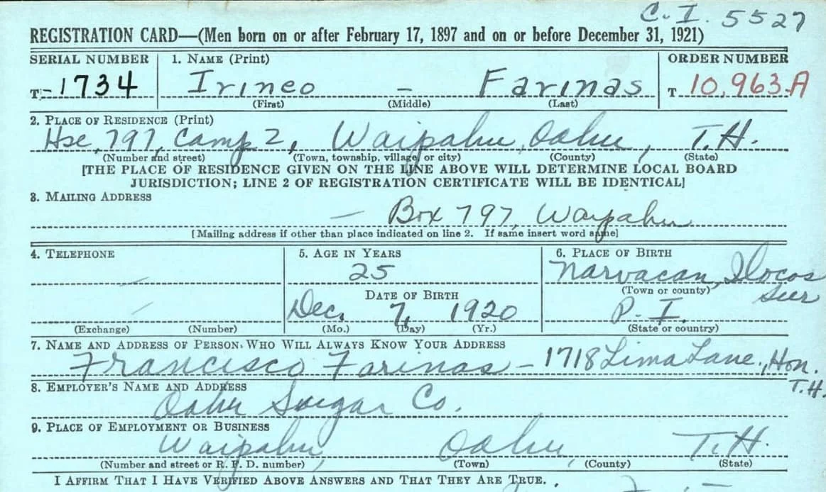 Irineo Farinas U.S. military draft registration card with the plantation as his home address. Photo: Gerald Farinas.